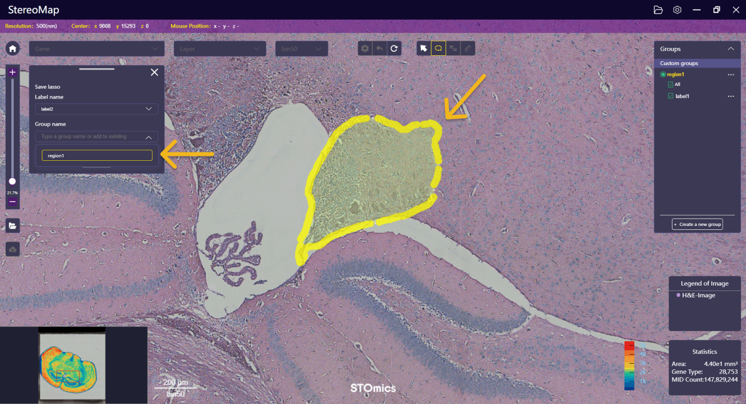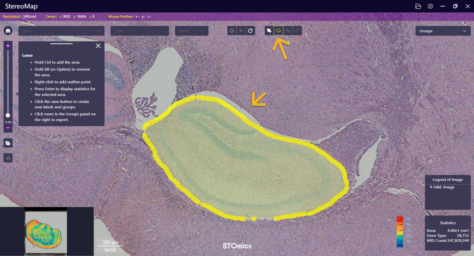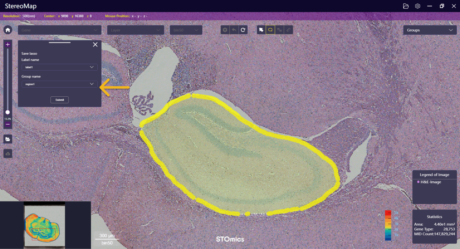 Following that, use the lasso function to annotate on the H&E image (similar to Characterize Substructure and Generate New Heatmap). Press Enter to complete the selection and click Save to naming the annotation.
