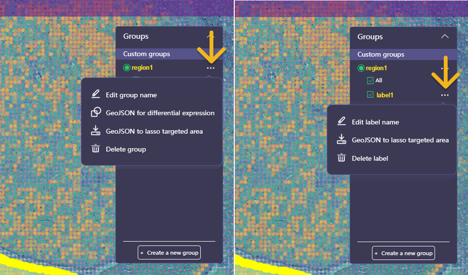 to the right of the group or label name and choose GeoJSON to lasso targeted area (export YYYYMMDDHHMMSS.lasso.geojson). Or, if you would like to understand the differences between annotated regions, choose GeoJSON for differential expression (export YYYYMMDDHHMMSS.diffexp.geojson). See Characterize Substructure and Generate New Heatmap for details on how to pass the GeoJSON file to SAW, and see Differential Expression Analysis for details on the explanation of differential expression methods and how to pass the GeoJSON file to SAW.