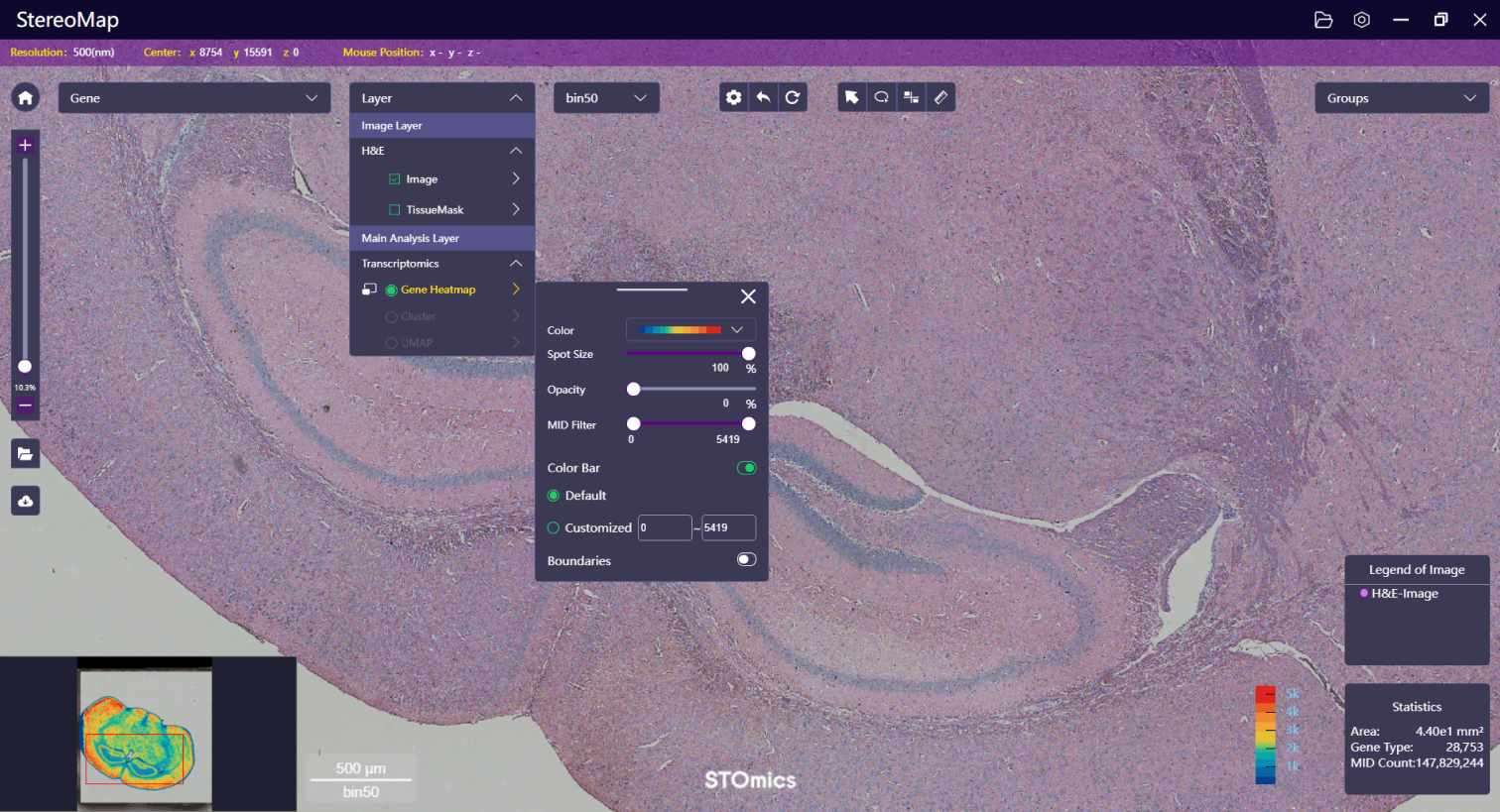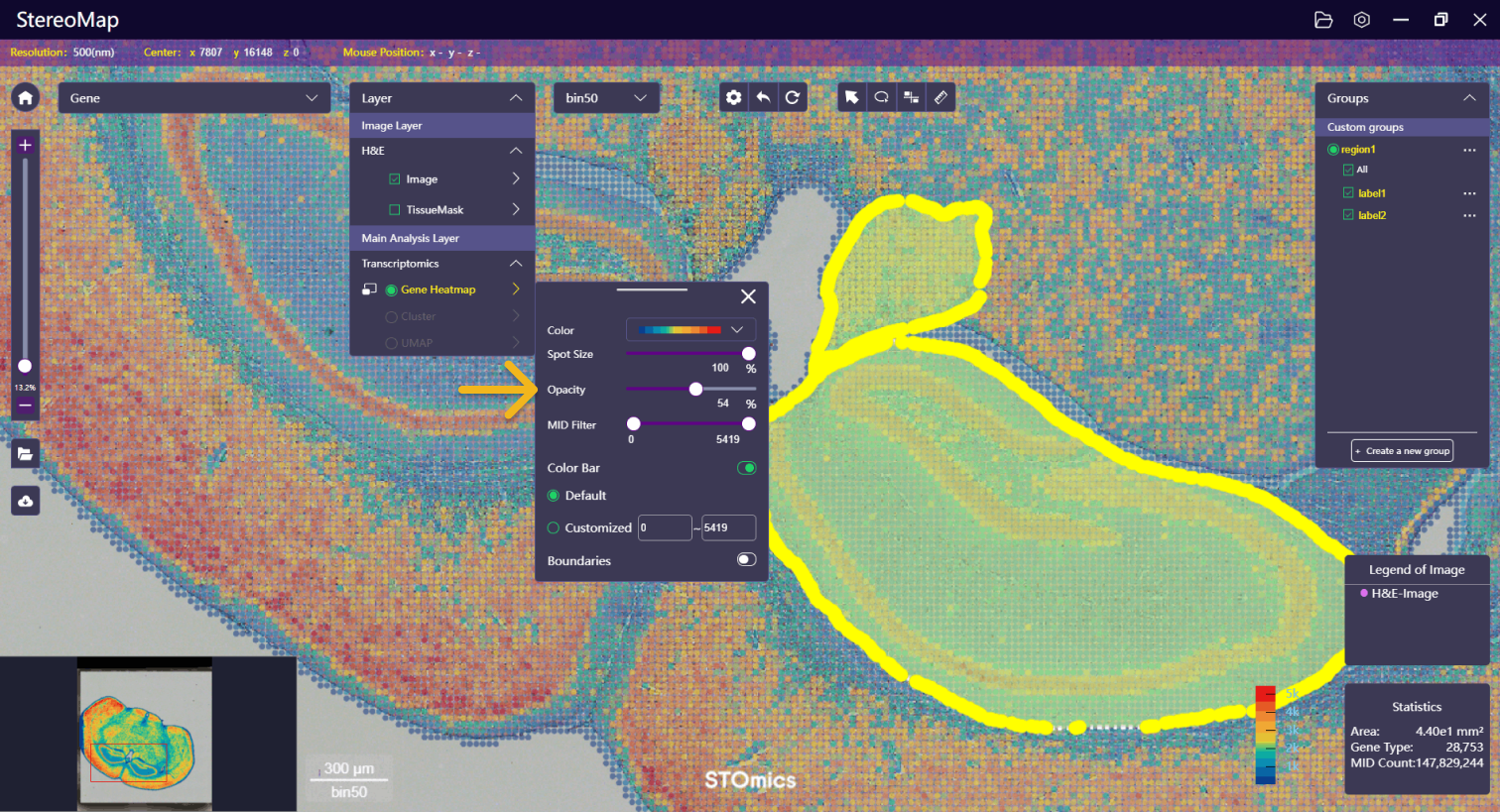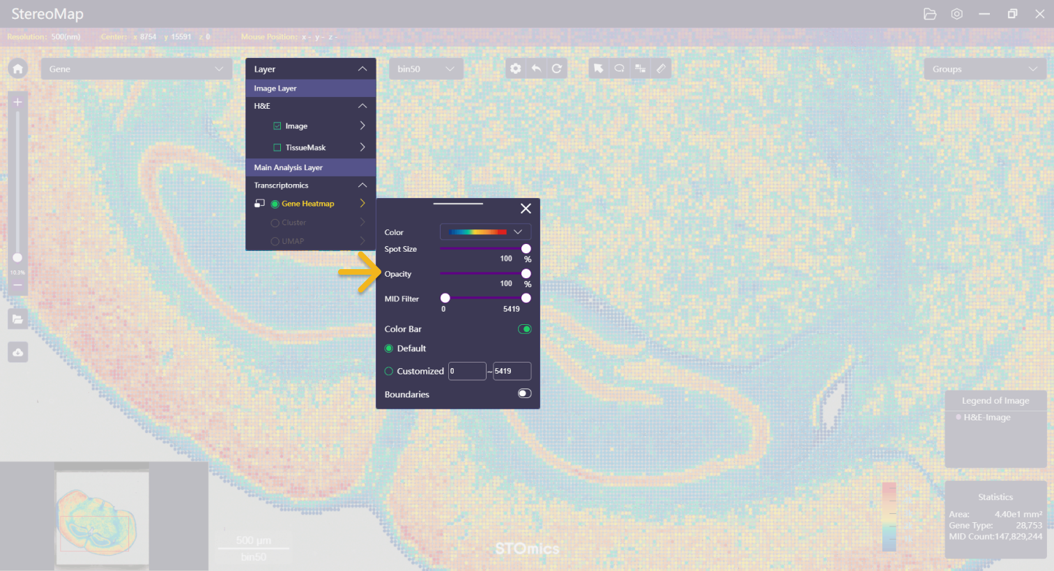 First, adjust the opacity of the feature expression heatmap to ensure the H&E image is visible.
