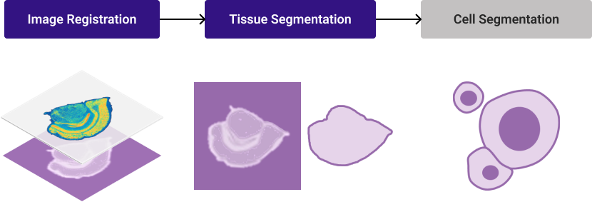 Register the image to the spatial feature expression density heat map. Overlap the image to the density map, and transform the image to match the orientation and the scale. For multiple IF images, please check the registration result of each image. Upon completion of this step, you can directly export the intermediate result and receive a TIFF format image. This image, which is the microscope image that has been reoriented and resized to align with the matrix, can be utilized with any third-party tools or algorithms to generate segmentation masks.