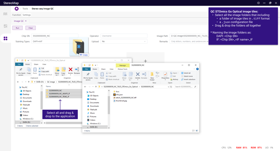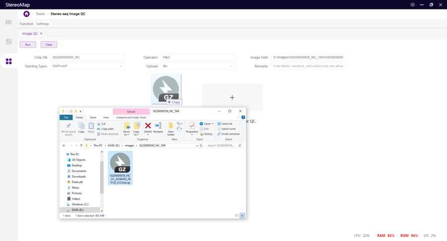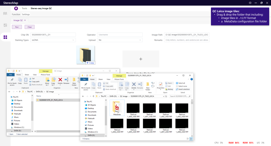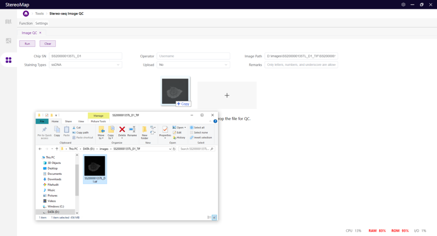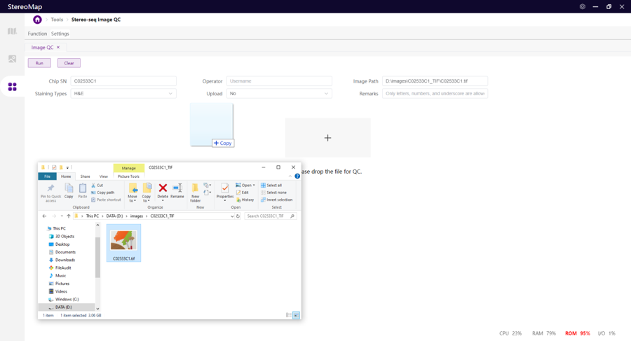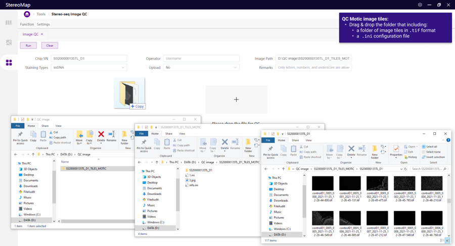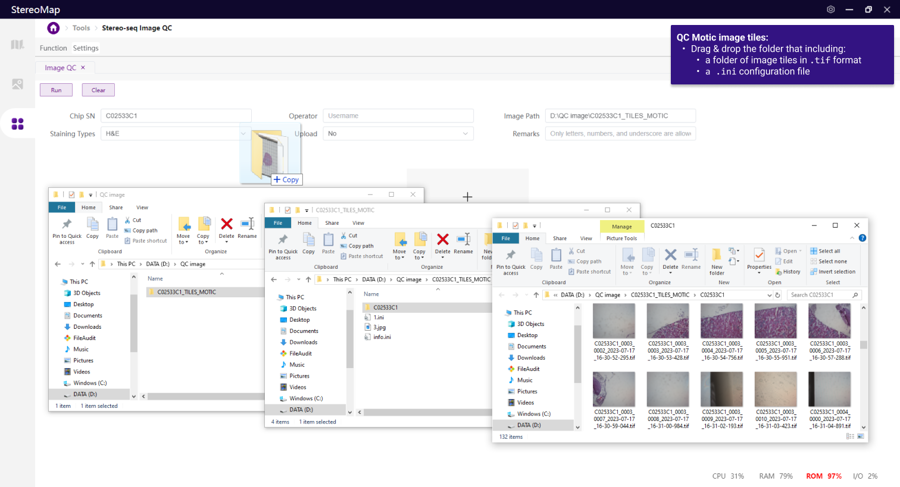 Open the image QC tool and drag the image to the window, the Image Information section will be automatically filled. Make sure at least the Chip SN, Operator, Image Path, and Staining Types have been accurately filled. The Run button will be available for clicking, allowing you to start a QC assessment.