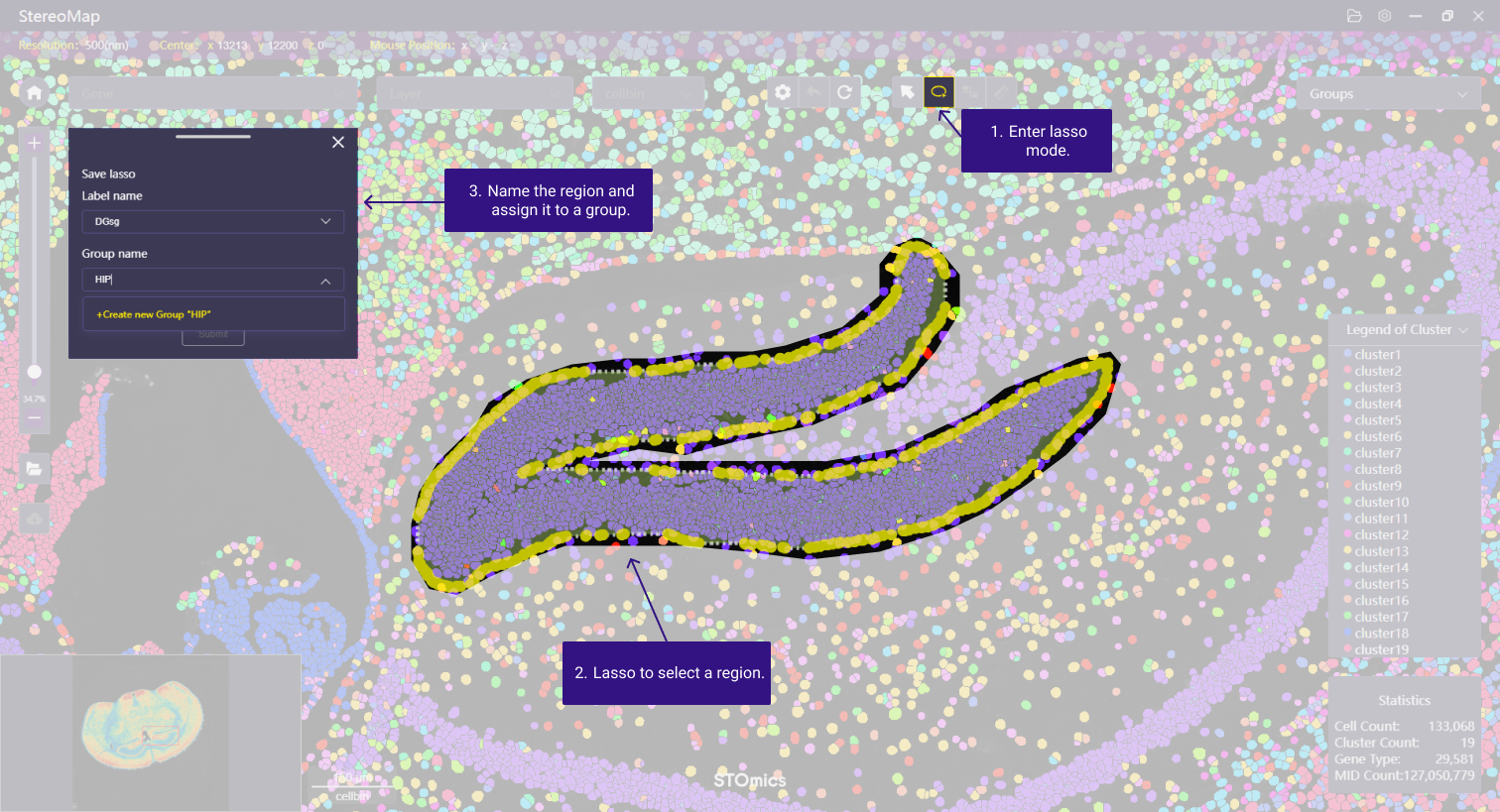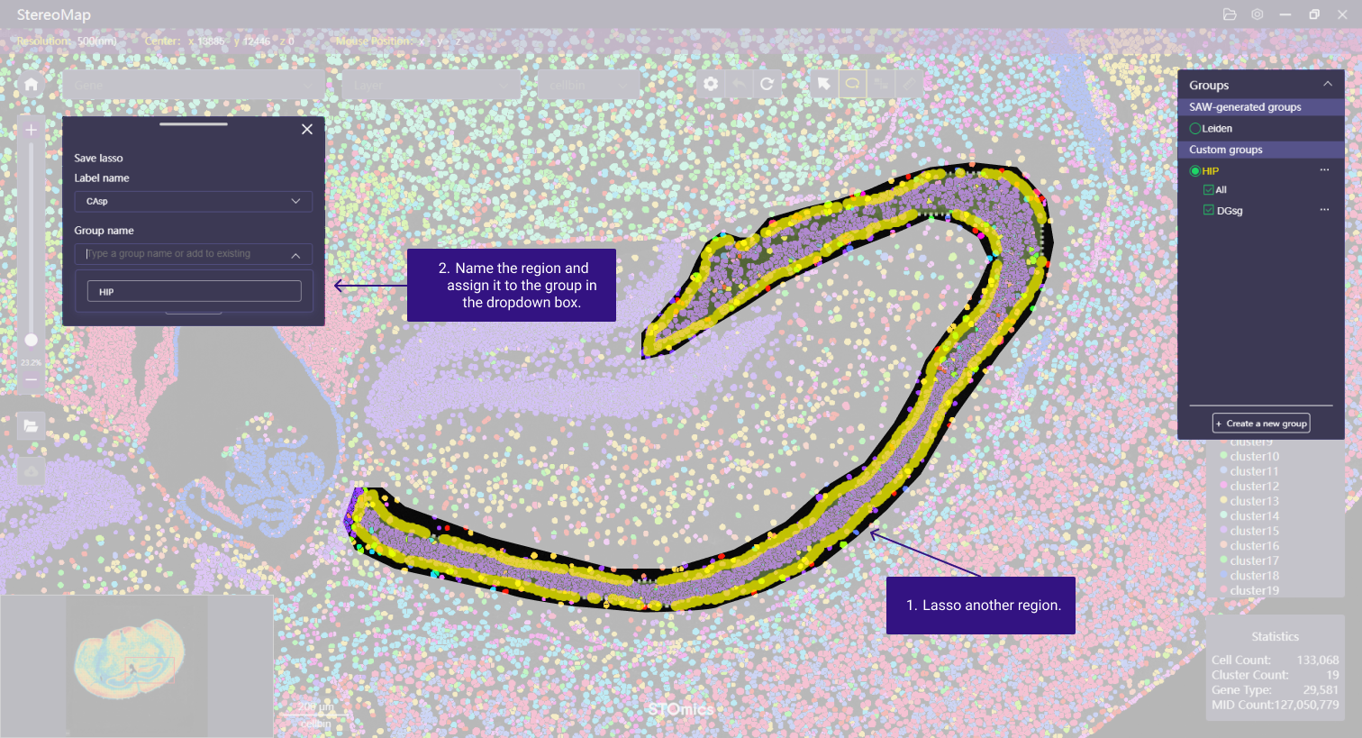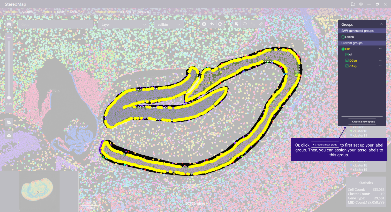 You can create a new group coupled with the Lasso function. Use the lasso to select a region, name the region name, and assign the label to the group. Or you can create new groups by clicking + Create a new group and assign the label to the created new group while saving lasso labels.