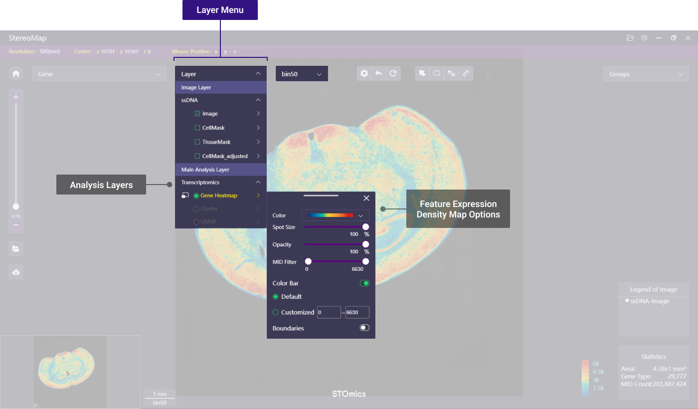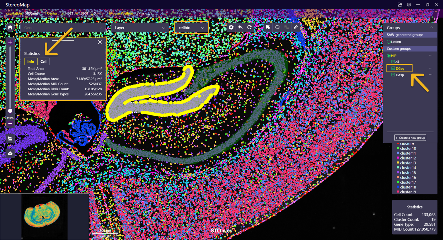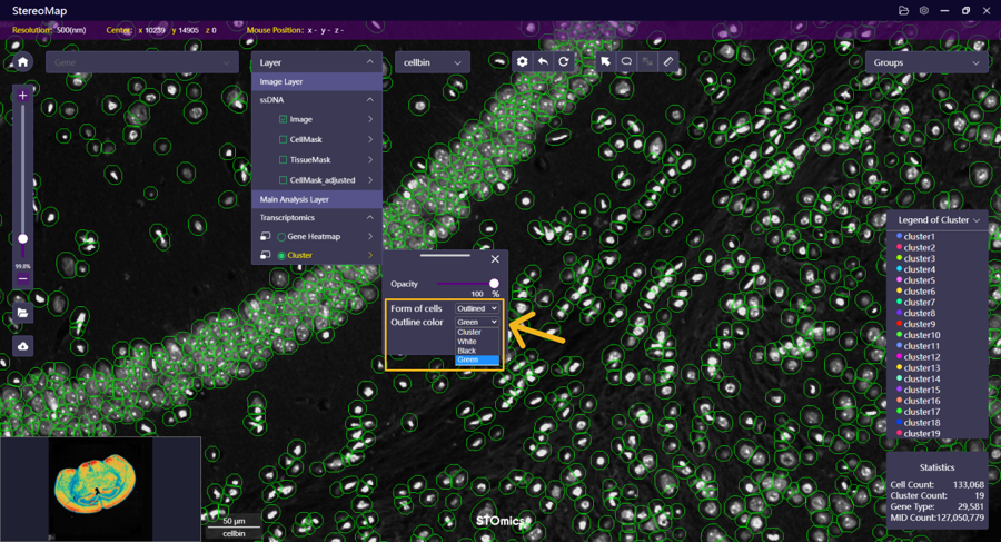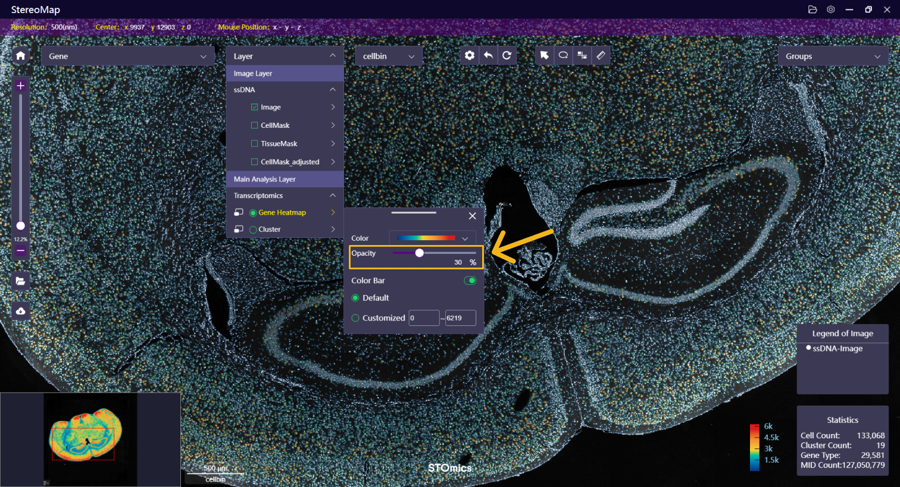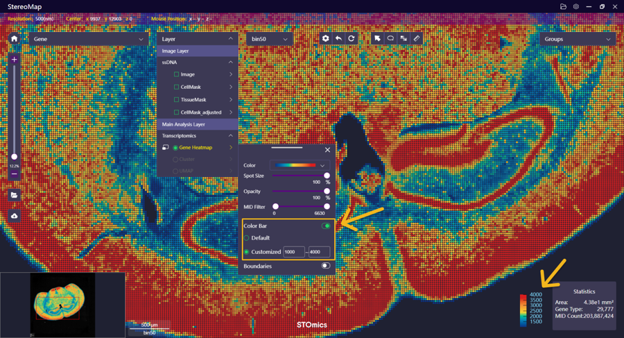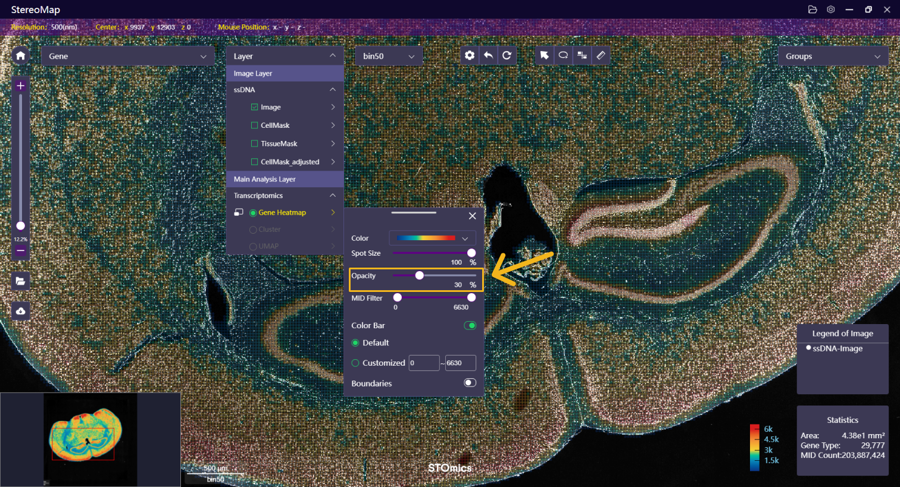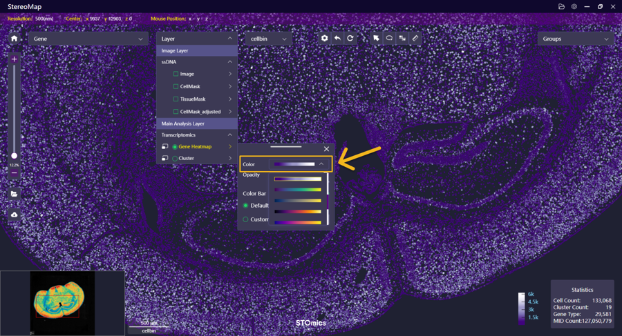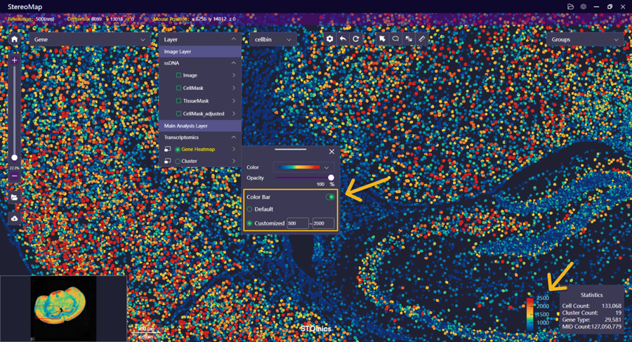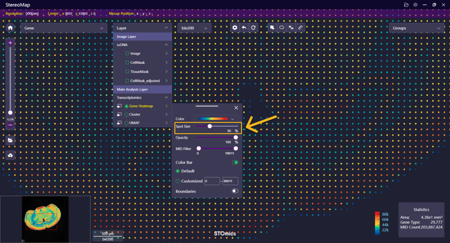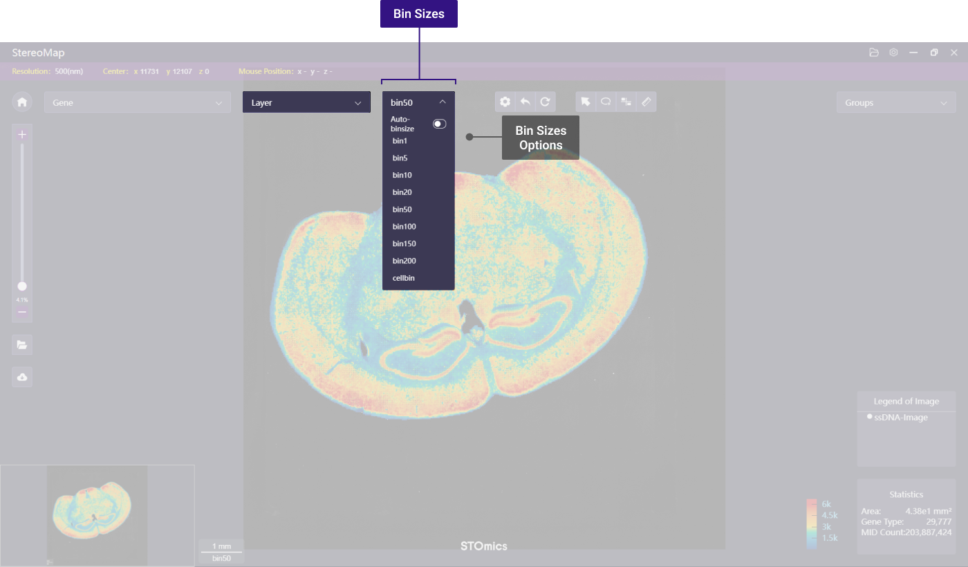 in front of the layer name. The windows are usually linked by the spot coordinates. See Microorganism and Host Genes for more information. The linked window can also be manipulated together by pre-defined feature pairs in Stereo-CITE dataset. Visit Spatial Distribution of Protein and its Corresponding Marker Gene for more information.The available bin sizes are 1, 5, 10, 20, 50, 100, 150, 200, and cell bin (only applicable if the dataset contains cell segmentation output). Bin 1 represents one DNB per bin, while Bin 5 represents 5 x 5 DNBs as a binning unit. Cell bin means binning DNBs based on the cell covered regions. There's also an Auto-binsize switch that you can toggle. When you turn on the Auto-binsize mode, the canvas resolution will automatically adjust based on the zoom-in and zoom-out magnification.