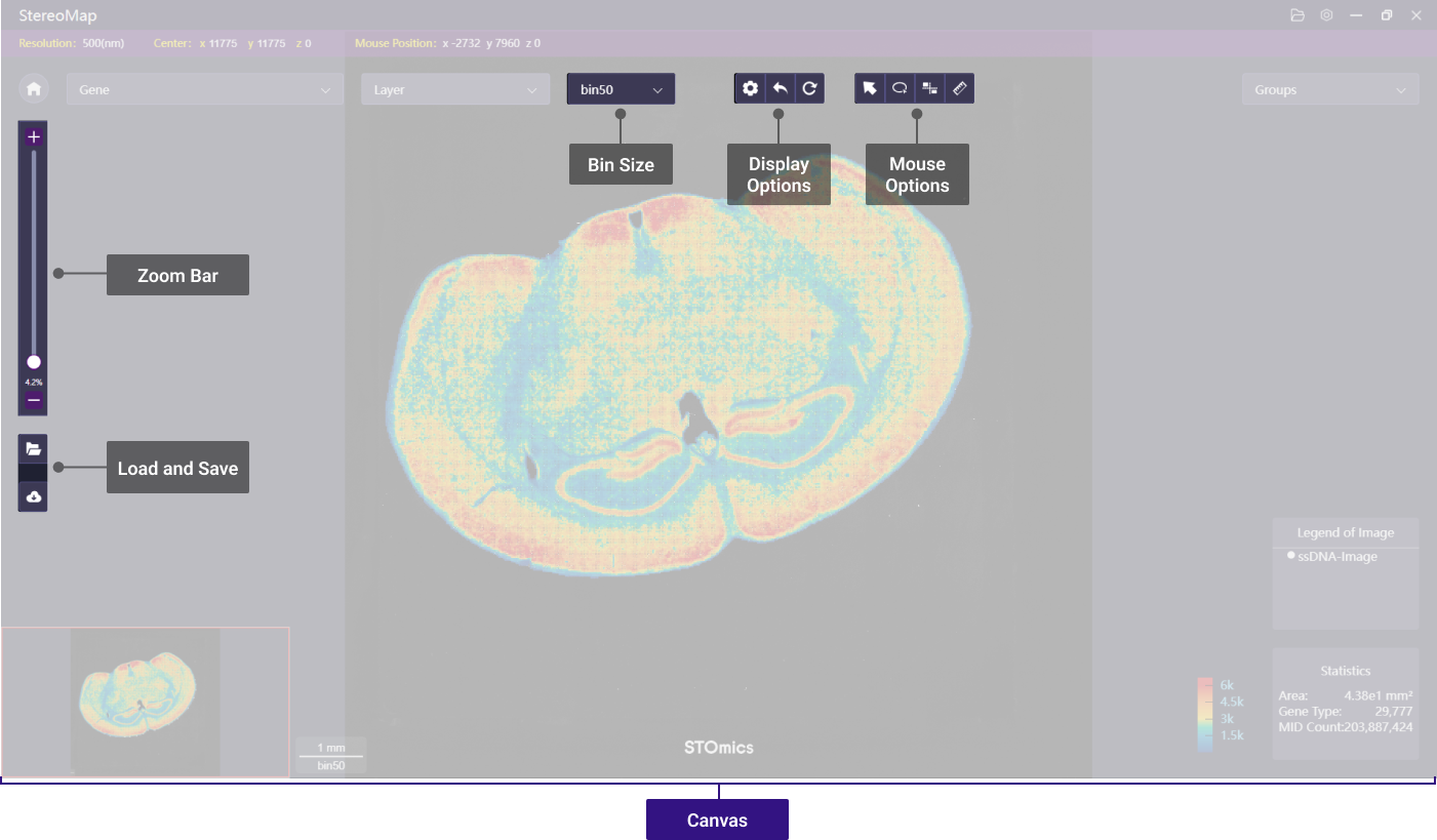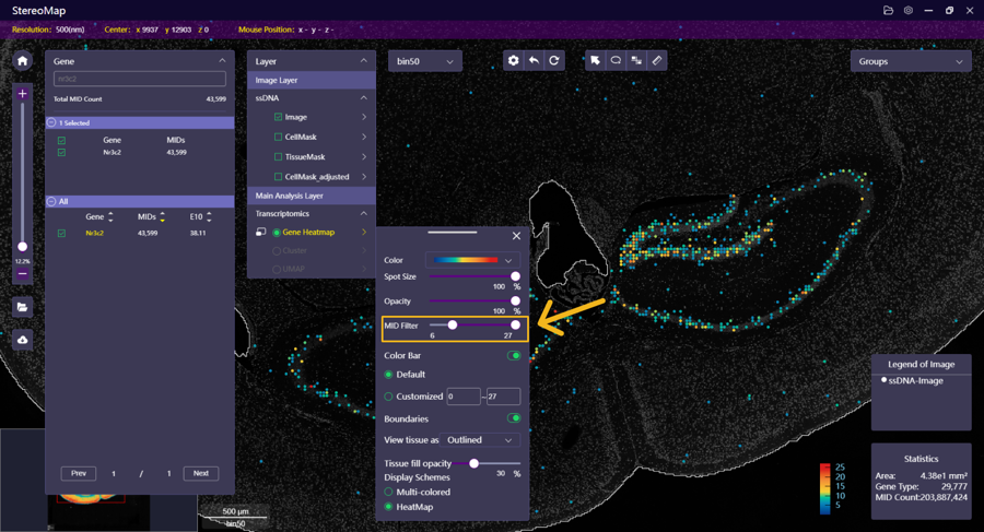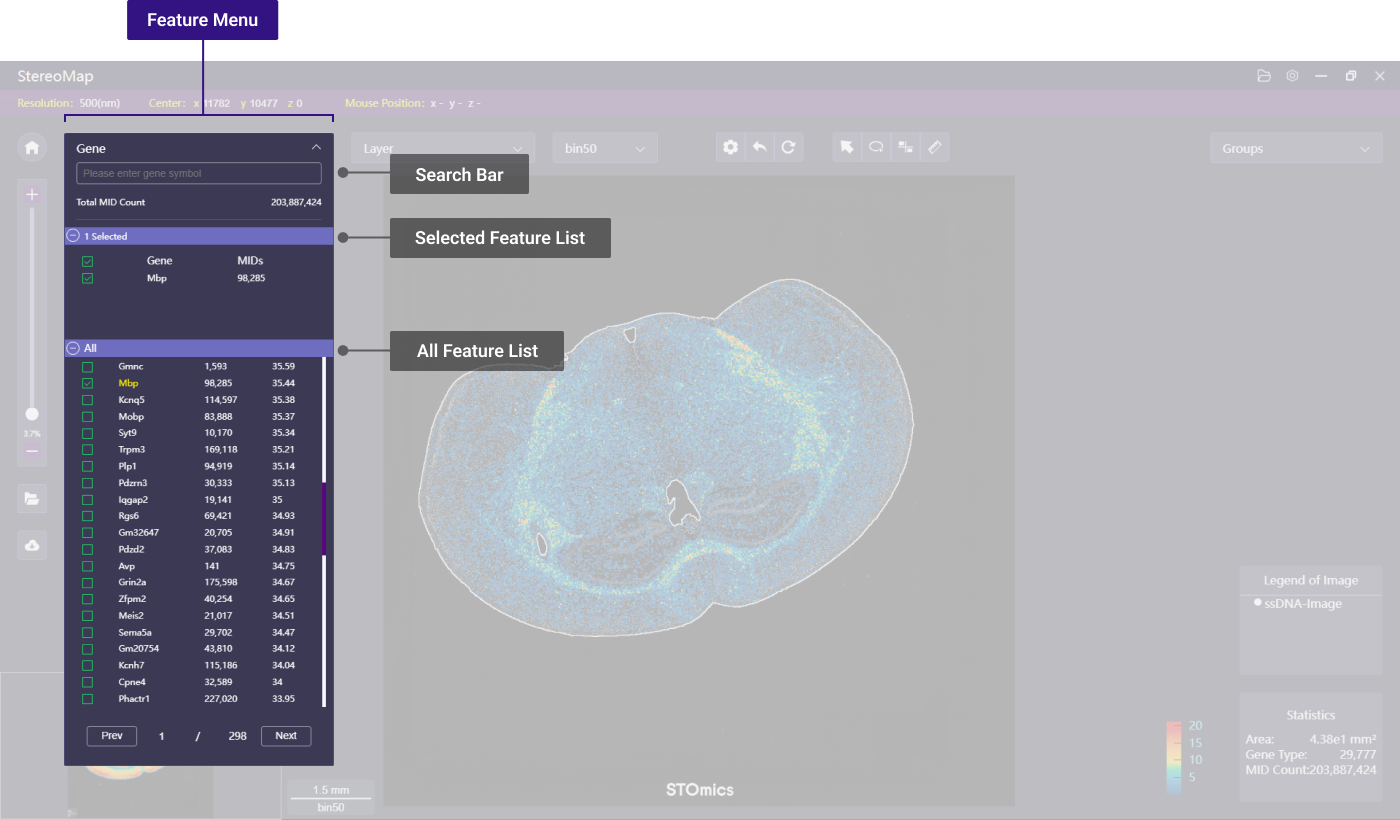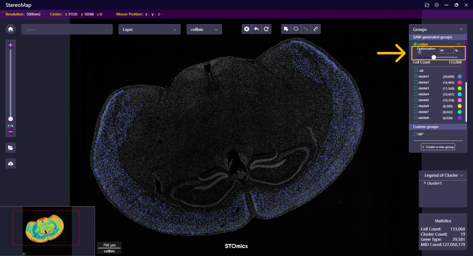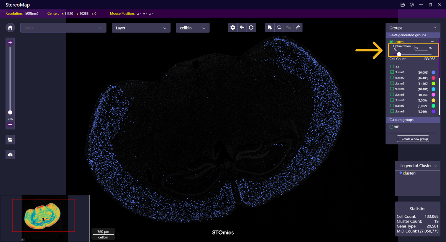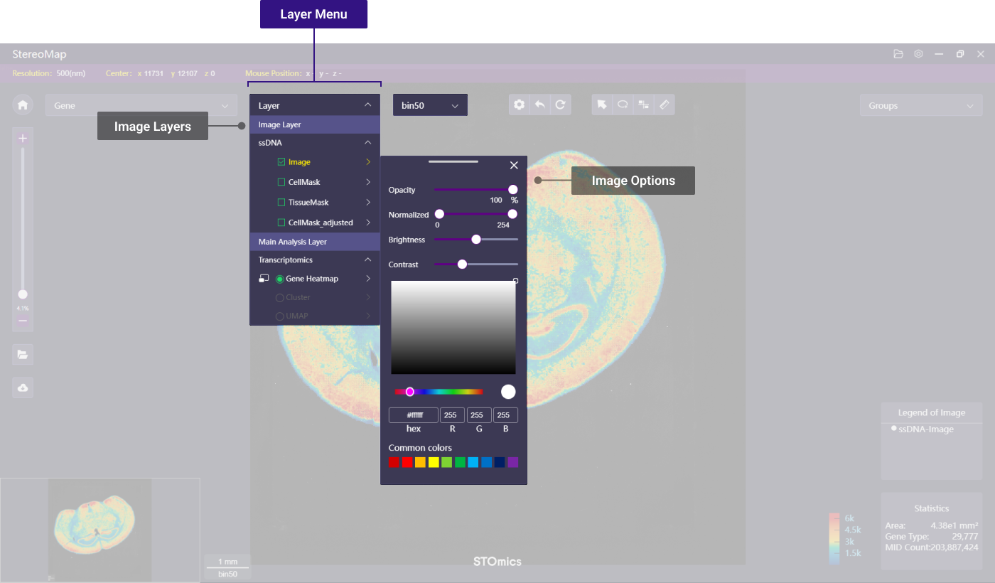 in front of the layer name. The windows are usually linked by the spot coordinates. See Microorganism and Host Genes for more information. The linked window can also be manipulated together by pre-defined feature pairs in Stereo-CITE dataset. Visit Spatial Distribution of Protein and its Corresponding Marker Gene for more information.The available bin sizes are 1, 5, 10, 20, 50, 100, 150, 200, and cell bin (only applicable if the dataset contains cell segmentation output). Bin 1 represents one DNB per bin, while Bin 5 represents 5 x 5 DNBs as a binning unit. Cell bin means binning DNBs based on the cell covered regions. There's also an Auto-binsize switch that you can toggle. When you turn on the Auto-binsize mode, the canvas resolution will automatically adjust based on the zoom-in and zoom-out magnification.
