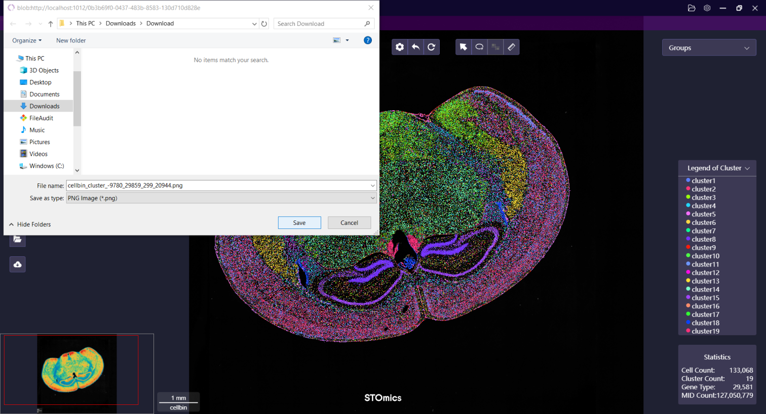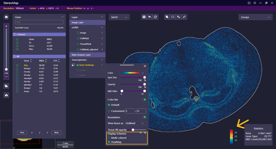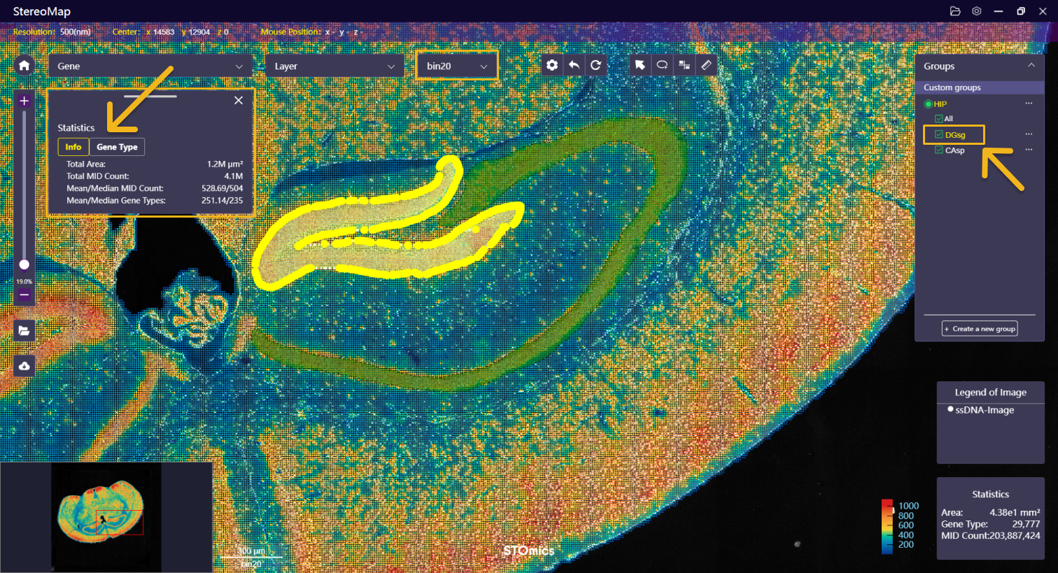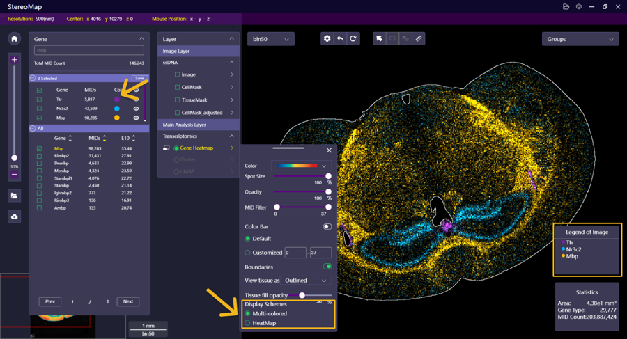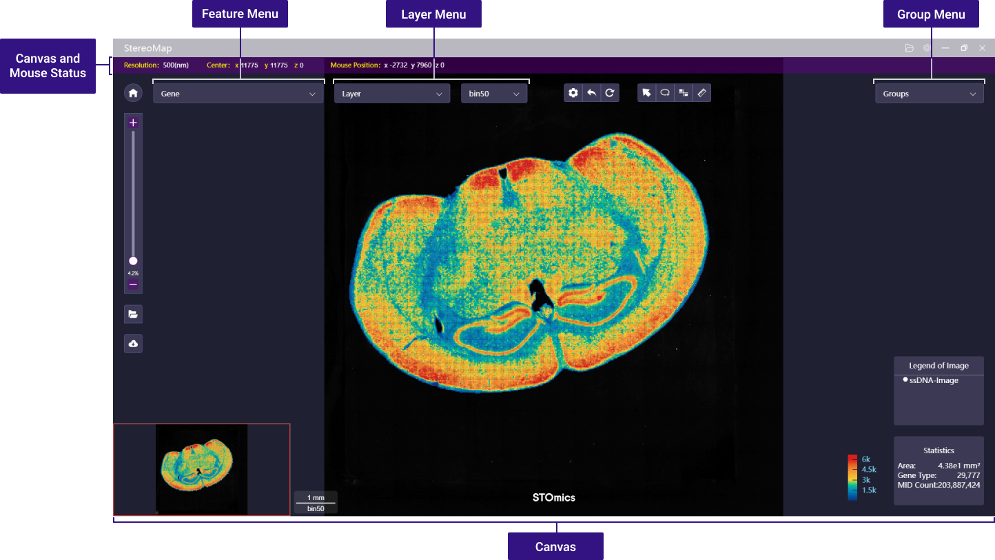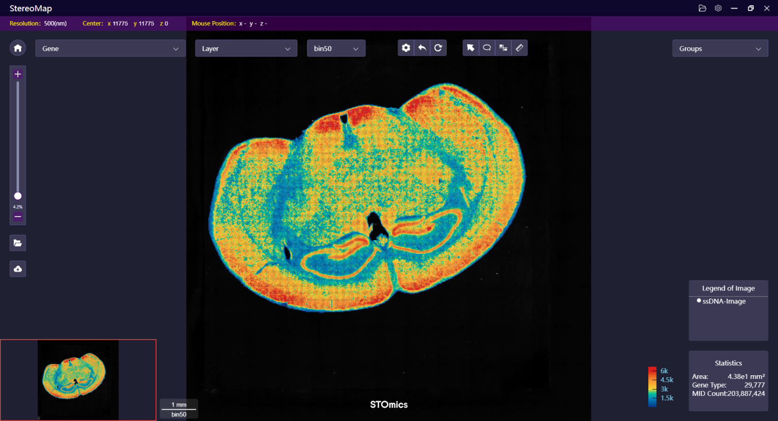 in front of the layer name. The windows are usually linked by the spot coordinates. See Microorganism and Host Genes for more information. The linked window can also be manipulated together by pre-defined feature pairs in Stereo-CITE dataset. Visit Spatial Distribution of Protein and its Corresponding Marker Gene for more information.The available bin sizes are 1, 5, 10, 20, 50, 100, 150, 200, and cell bin (only applicable if the dataset contains cell segmentation output). Bin 1 represents one DNB per bin, while Bin 5 represents 5 x 5 DNBs as a binning unit. Cell bin means binning DNBs based on the cell covered regions. There's also an Auto-binsize switch that you can toggle. When you turn on the Auto-binsize mode, the canvas resolution will automatically adjust based on the zoom-in and zoom-out magnification.