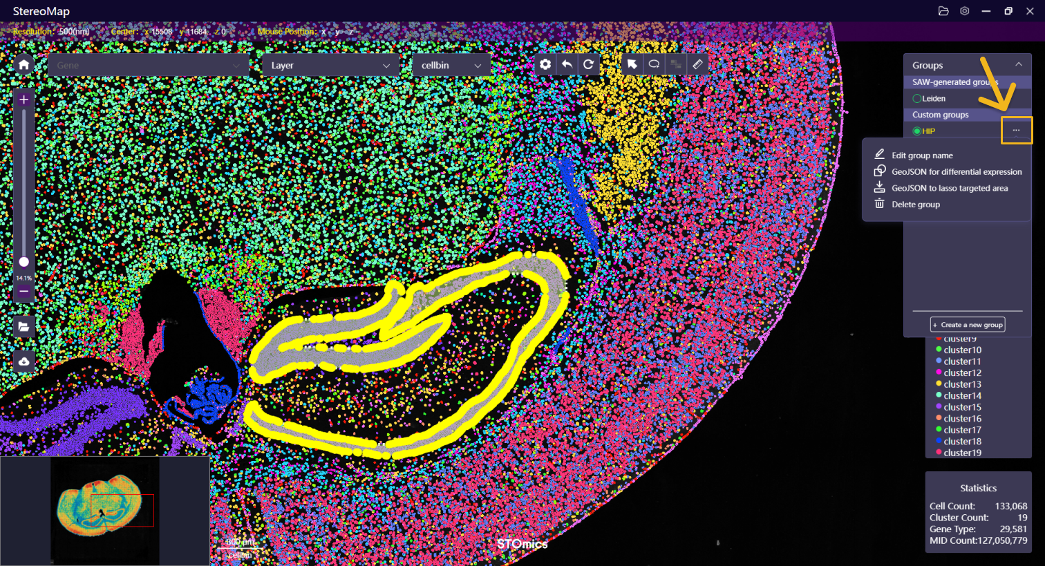 after the group name to edit name or export region coordinates in GeoJSON format. You can also export differential expression analysis required parameters by clicking GeoJSON for differential expression. See Differential Expression Analysis for more information.