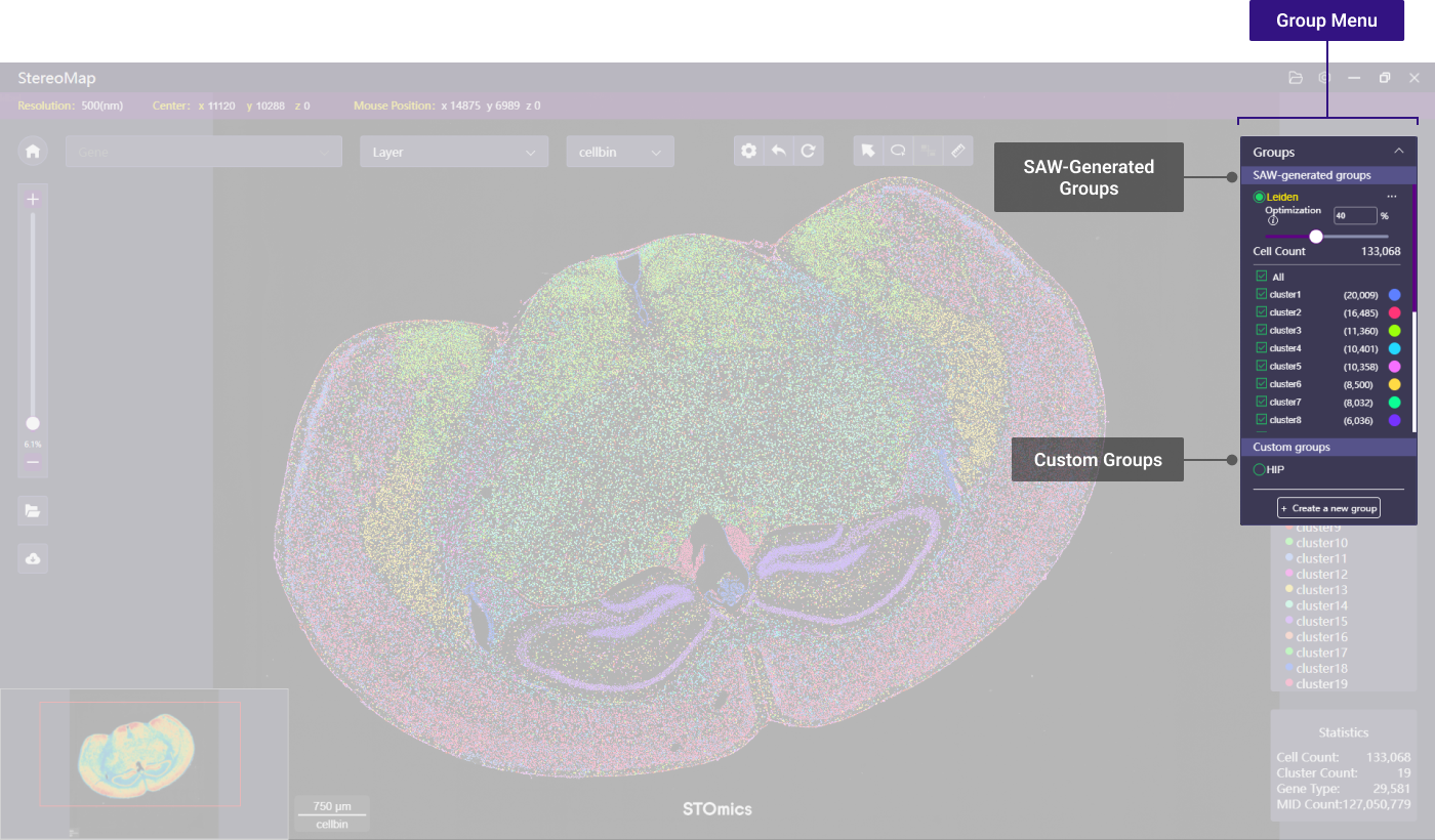 The Group menu lists the spot/region groups. The group includes two types, SAW-generated groups and custom groups. SAW-generated groups list the clusters computed in SAW pipelines (SAW count, SAW realign, SAW reanalyze).