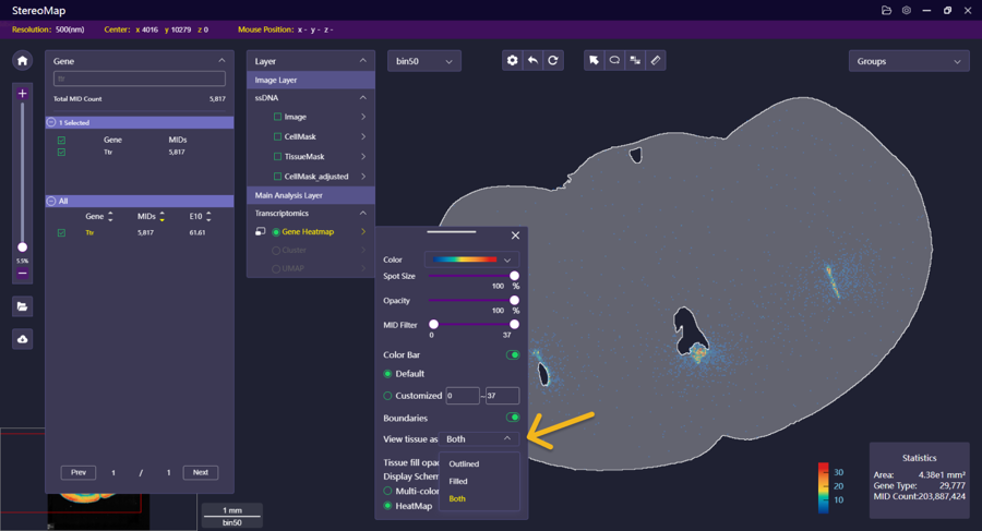 Show or hide tissue boundary generated from image or expression matrix. The boundary can be displayed as the outline, filled polygon, or both. The opacity of the filled polygon is adjustable.