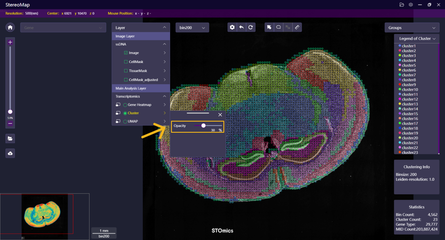 Adjust the clustering layer opacity for simultaneously visualize image layers.