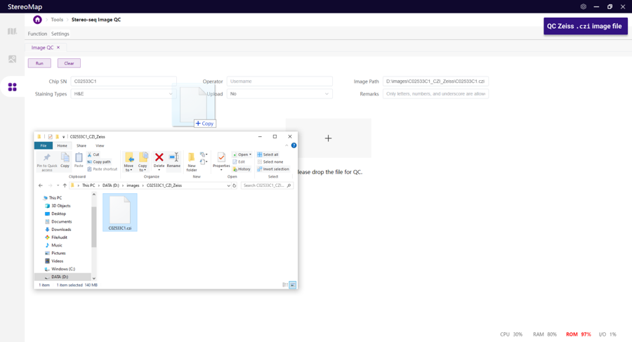 StereoMap supports various file formats for image QC, including standard TIFF files and microscope-specific formats such as CZI (Zeiss) and tiled image formats (Motic). It is highly recommended to use TIFF files due to their widespread compatibility and optimal performance.