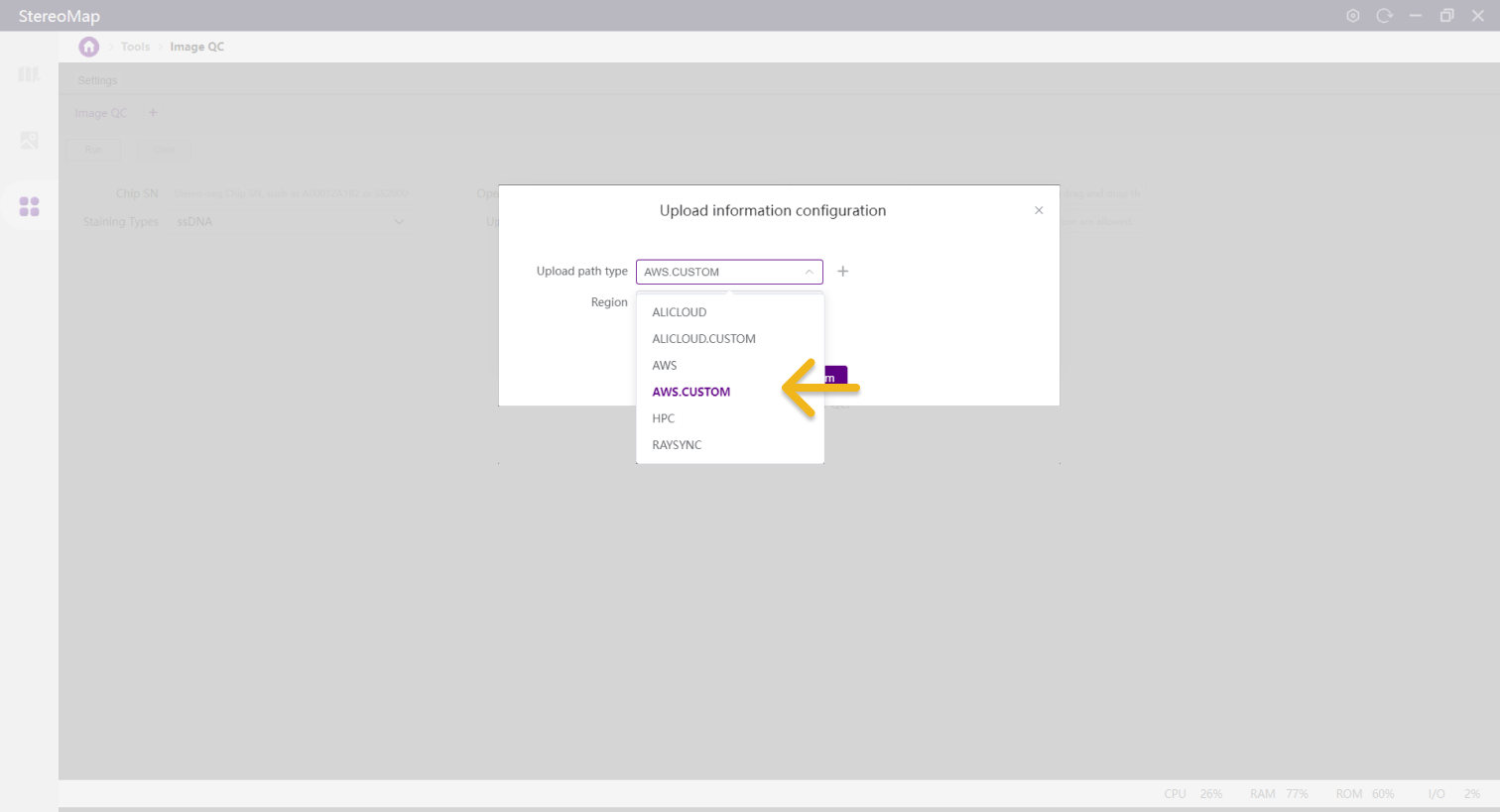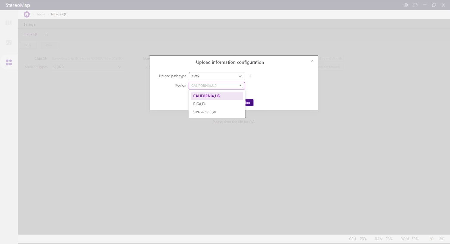 Transfers images using Amazon Web Service (AWS). Best for users where STOmics Cloud is deployed on AWS. Contact FAS for new region setup if needed.