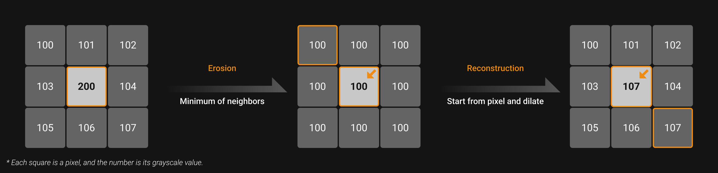 Reconstruction step: Using the eroded image as a “seed,” morphological reconstruction is performed pixel-wise on the original image. The reconstruction dilates connected regions outward, but never beyond the original pixel intensities. The noise pixel, now at 100 and connected to surrounding pixels, can only recover up to the local maximum intensity in the original image (e.g., 107). Normal pixels that were less eroded can fully restore their original values (e.g., 101, 102).