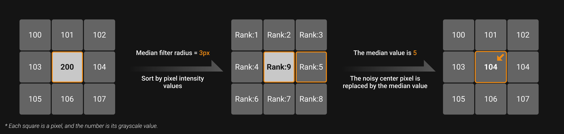 For instance, if the median filter radius is set to 3 pixels (corresponding to a 3×3 window), and the window contains eight pixels with grayscale values around 100 and one noisy pixel with a value of 200, the sorted values yield a median of 104. The noisy center pixel is then replaced with this median, effectively reducing noise while preserving edges.