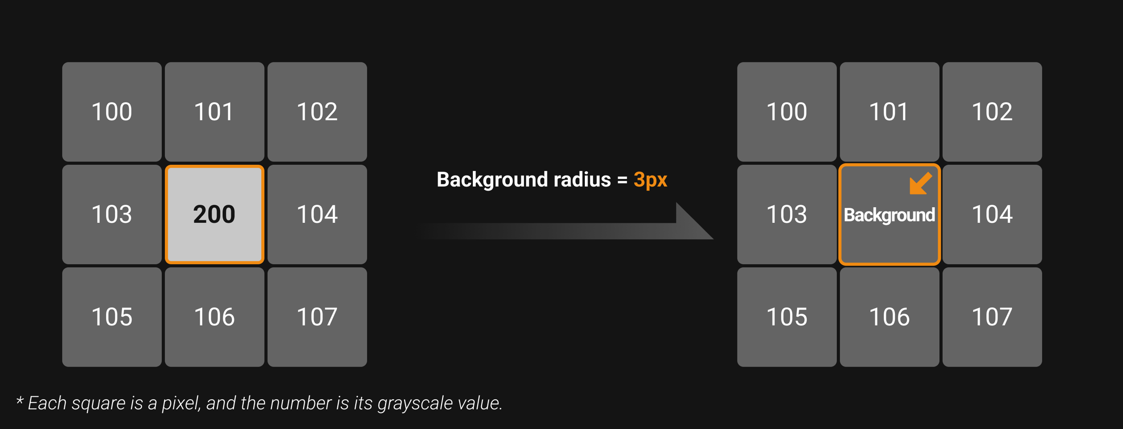 For each pixel in the image, the Background Radius parameter determines a square neighborhood around the pixel based on the specified radius. The features of the pixels within this neighborhood (such as grayscale values) are then analyzed to estimate the background characteristics, allowing the algorithm to determine whether each pixel belongs to the background.