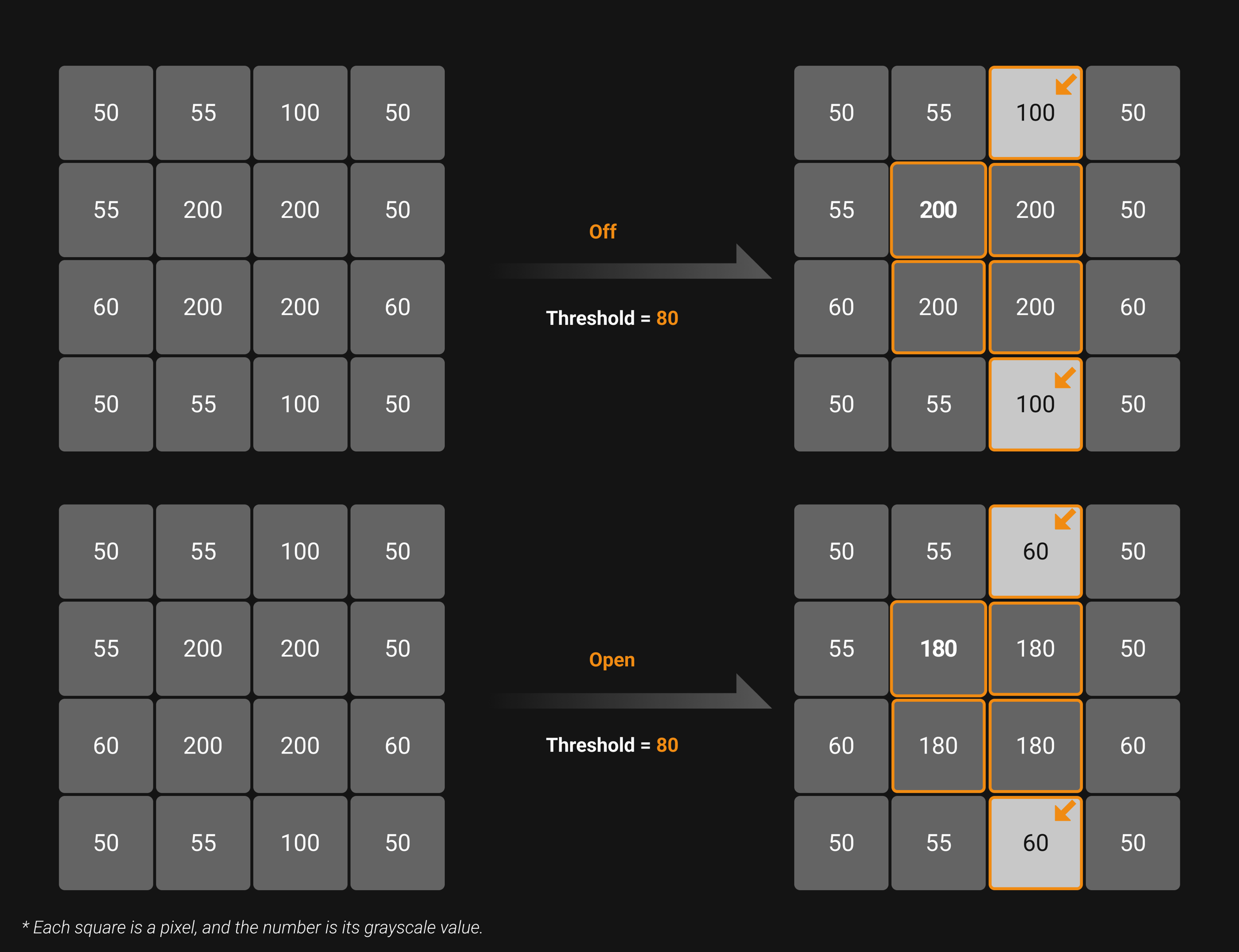 For example, in a 4×4 neighborhood with a Threshold set to 80: