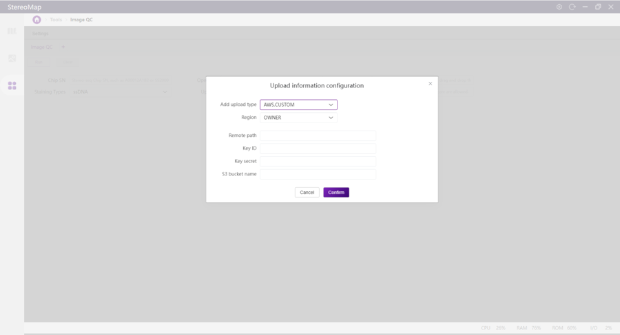 Transfers images using Amazon Web Service (AWS). Best for users where STOmics Cloud is deployed on AWS. Contact FAS for new region setup if needed.