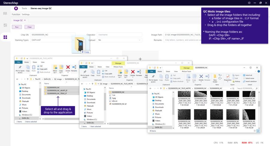 Quick start: Processing QC-failed Image. You can still co-visualize the image with the feature density map. To do this, input the image file into the StereoMap Image Processing module. You may need to manually adjust or rectify issue steps before transferring the image to SAW.
